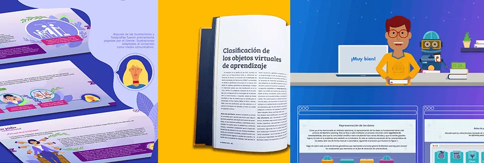 El diseño de un curso virtual, sus imágenes, textos e interacciones son totalmente distintos a los que se presentan al interactuar con un libro, periódico o revista física. Estos conceptos cambian totalmente en un entorno virtual, y es aquí donde la magia de la programación y animaciones toma protagonismo.